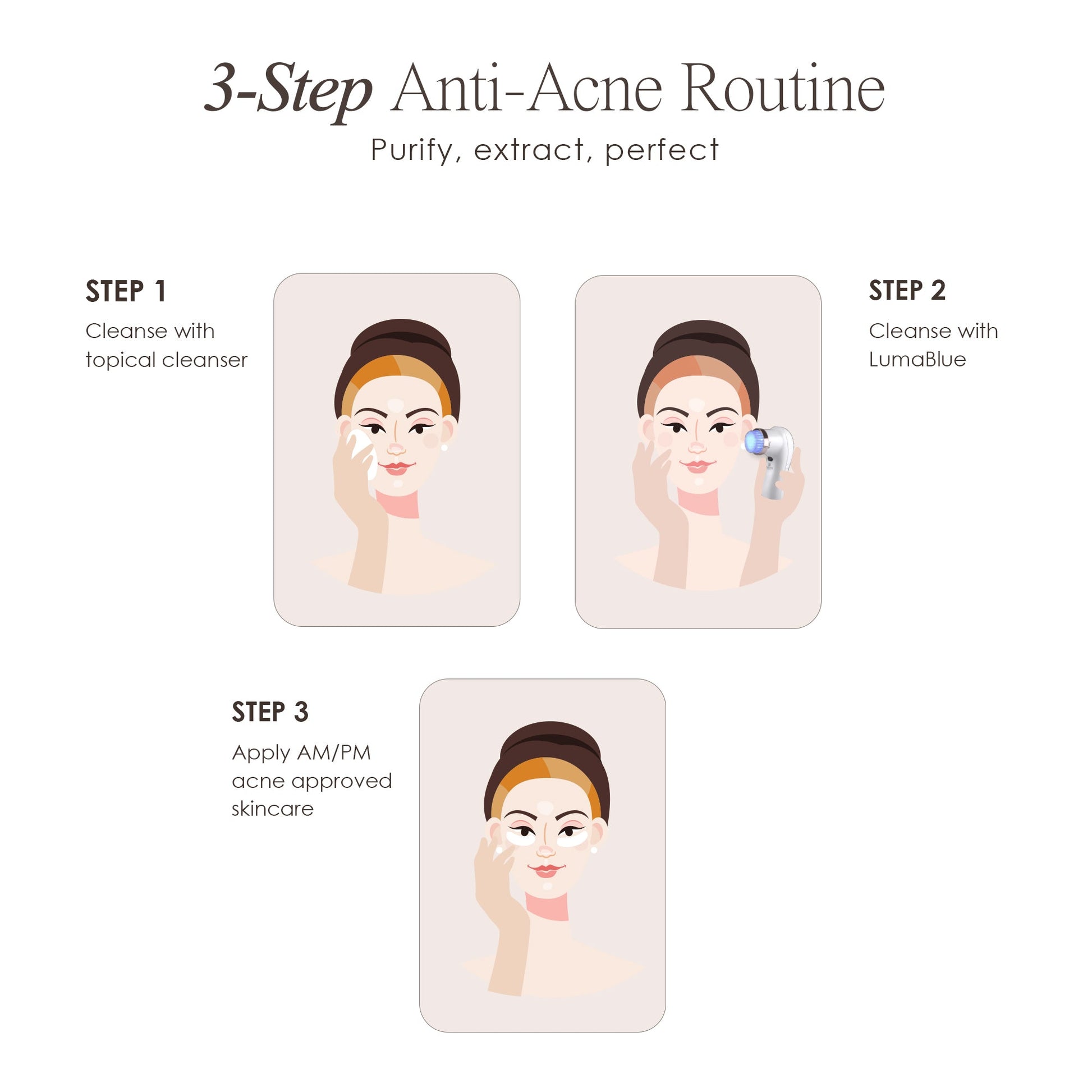 • Blue light therapy deeply targets acne-causing bacteria to treat and prevent acne flare-ups