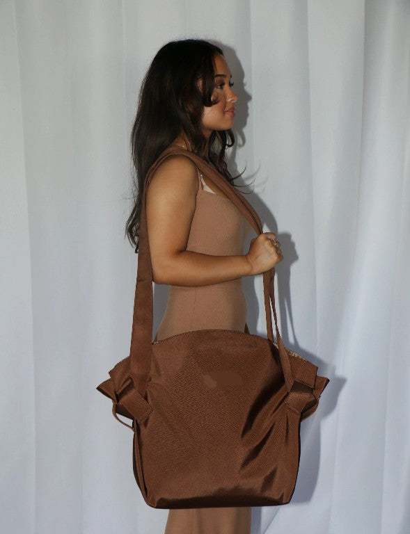 In bag mode, the distance from the tip of the strap tothe tip of the bag is approximately 19 inches. For reference, the model is 5'3.